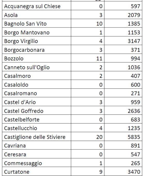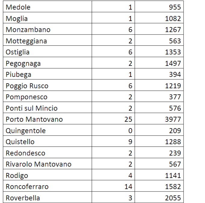 I comuni che vedono il maggior numero di contagi restano Castiglione delle Stiviere con 5.835, Mantova con 10.114, Suzzara con 4.849 e Viadana con 5.038.