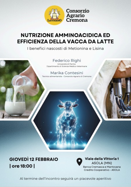 La conferenza sarà guidata dal docente di Scienze Medico-Veterinarie Federico Righi e dalla consulente tecnica Marika Contesini. Gli esperti, durante l’incontro intitolato “Nutrizione amminoacidica ed efficienza della vacca da latte. I benefici nascosti di Metionina e Lisina”, illustreranno come la nutrizione amminoacidica possa favorire il benessere della vacca da latte e ottimizzare i costi di produzione.
