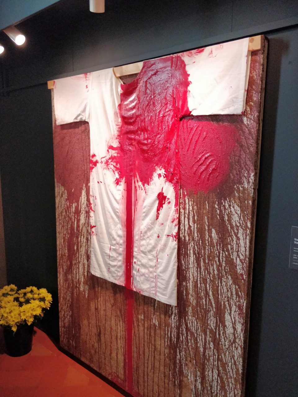 Dopo settimane di polemiche roventi, quando si arriva all’ingresso di Katharsis, la mostra di Hermann Nitsch appena allestita nel Palazzo Ducale di Mantova, ci si potrebbe aspettare di trovare ciò per cui è stato sollevato un polverone: sangue, animali o chissà quale altra provocazione. E invece, una volta dentro, niente di tutto ciò. Una quindicina di opere del tutto “innocue” distribuite su tre sale del Palazzo Ducale. Tanto colore, tanto rosso, tanti richiami alla religione e al cristianesimo: dai paramenti ecclesiastici schizzati di colore o allestiti con strumenti medici e fazzoletti di carta impilati, fino a magliette inzuppate di colore – quasi sempre rosso vivo. A richiamare sì il sangue e la crocifissione di Cristo. Ma di sangue non c’è traccia, come nemmeno di animali morti e macellati o di altre provocazioni dello stesso tenore.