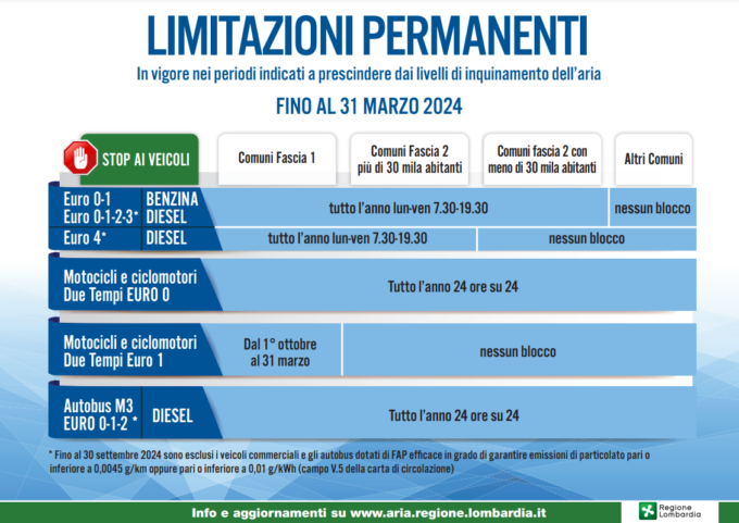 - Veicoli Euro 0, 1 con alimentazione metano/GPL: A partire dal 1° aprile 2024, le limitazioni permanenti si applicano dal lunedì al venerdì (escluse le giornate festive infrasettimanali), dalle 7,30 alle 19,30, permanentemente tutto l’anno, nei Comuni di Fascia 1 e Fascia 2 (in totale 570 Comuni) della Lombardia. L’applicazione delle limitazioni temporanee per questi veicoli invece entra in vigore dal 1° ottobre 2023.