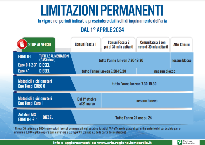 Come specificato dal provvedimento, dallo scorso 1° ottobre 2023, i veicoli Diesel Euro 4 non potranno circolare dal lunedì al venerdì (escluse le giornate festive infrasettimanali), dalle 7,30 alle 19,30, nei 209 Comuni di Fascia 1 e nei Comuni di Fascia 2 con popolazione superiore a 30.000 abitanti (quest’ultimi sono Varese, Lecco, Vigevano, Abbiategrasso e S. Giuliano Milanese).