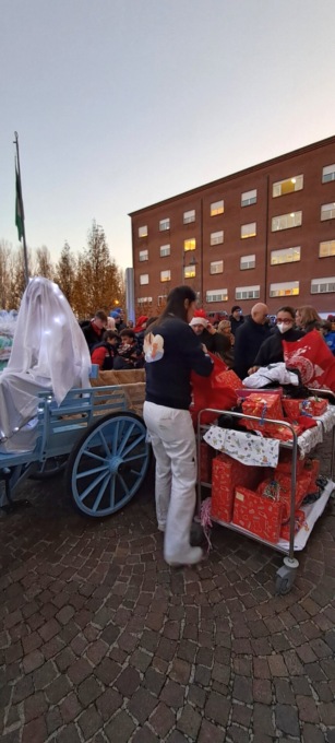 Dopo una suggestiva sfilata delle forze dell’ordine di fronte alla sede del Poma, Santa Lucia ha fatto il proprio ingresso nel piazzale dell’ospedale su un carretto trainato da un asinello. A rendere ancora più magico il momento, un coro di bambini della scuola media Leon Battista Alberti ha eseguito canti natalizi.