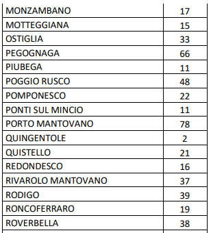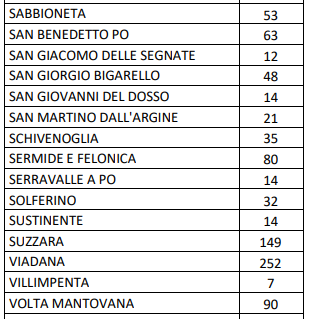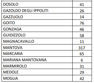 Castel Goffredo (132), Castiglione delle Stiviere (250), Mantova (317) e Viadana (252) rimangono i comuni con il maggior numero di contagi.