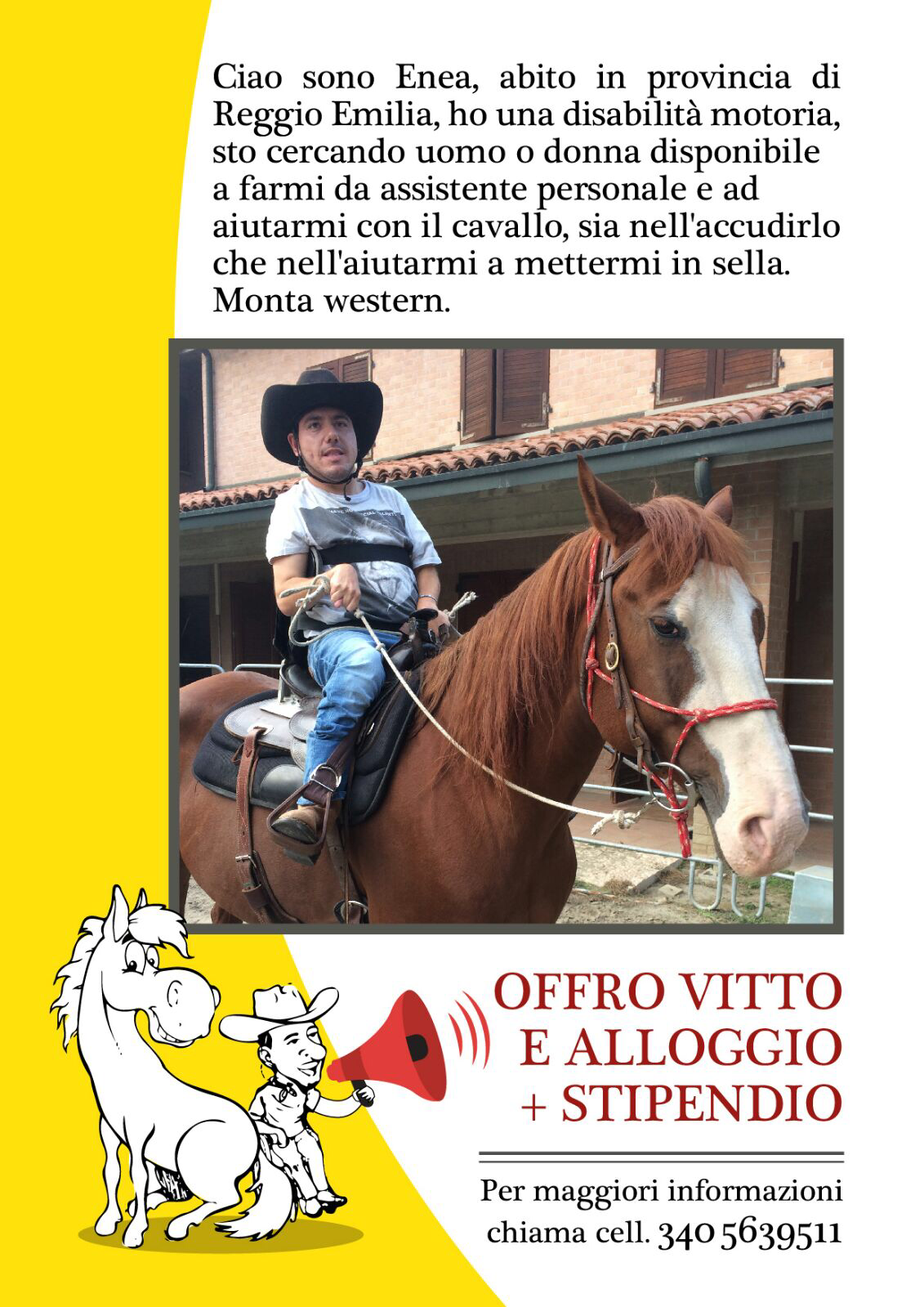 Enea fa le cose sul serio: offre vitto, alloggio e anche stipendio a coloro che si prenderanno cura di lui e del suo splendido cavallo. Non un semplice lavoro di assistenza, quindi, ma anche un affiancamento ad Enea nella sua passione per i cavalli. Un annuncio di lavoro con i fiocchi che potrebbe davvero interessare moltissime persone appassionate ed empatiche.