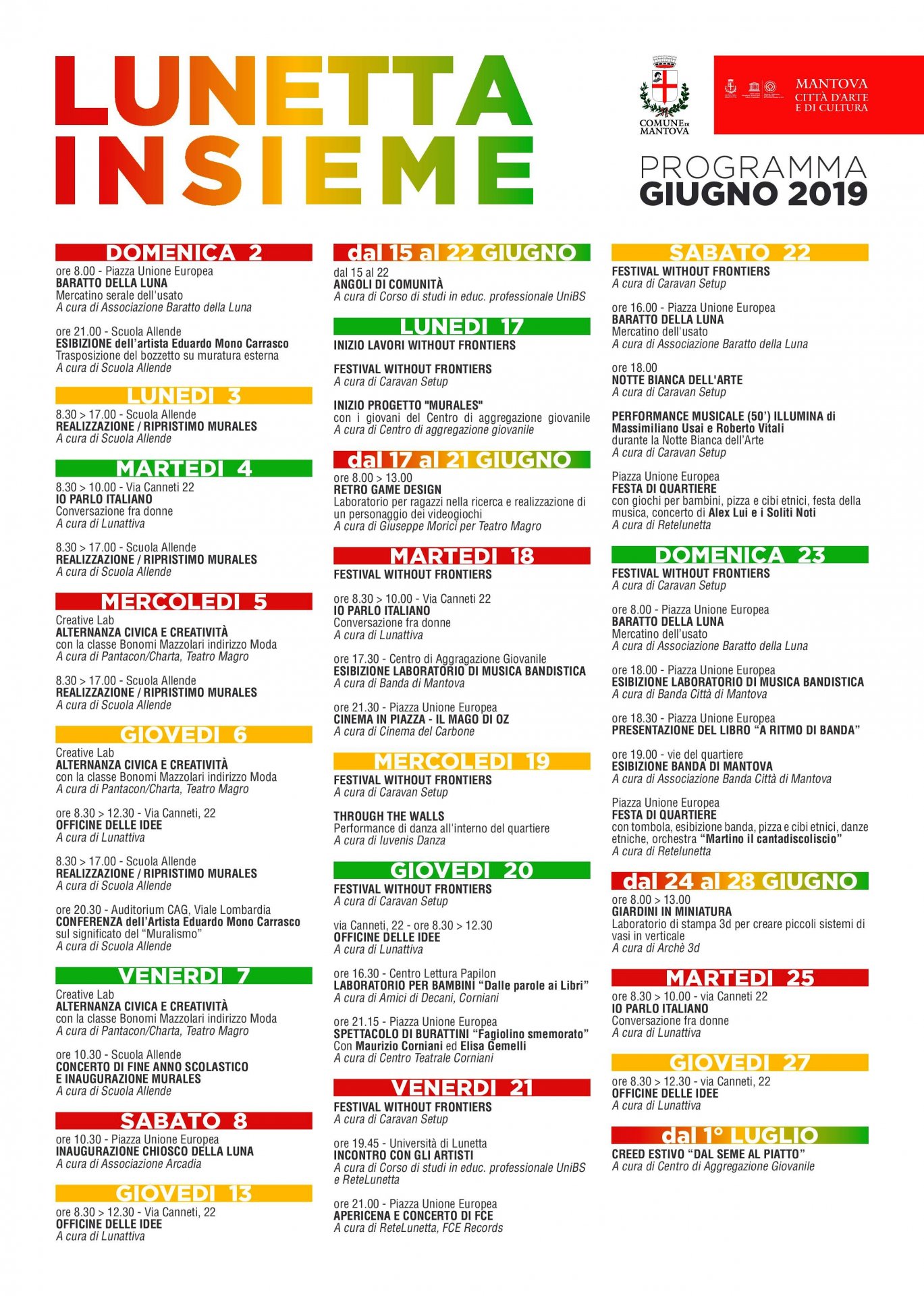 Tra gli eventi principali la festa del quartiere, “Lunetta in Festival”, dal 17 al 23 giugno 2019 che prevede, tra le varie cose, musica, cinema, laboratori, mercatini, incontri con artisti, giochi per bambini e stand gastronomici. Poi il festival “Without Frontiers”, sempre dal 17 al 23, con otto artisti di strada, italiani e stranieri, che lavoreranno come di consueto su grande scala sui “muri” del quartiere e l’inizio del progetto “Murales” a cura del Centro di aggregazione giovanile. Inoltre, sabato 22 giugno, a partire dalle 18, la “Notte Bianca dell’Arte”, a cura di Caravan Setup, alla quale parteciperanno oltre 50 artisti di street art. Sempre il 22 giugno, in piazza Unione Europea, il momento centrale della Festa di quartiere con giochi per bambini, pizza e cibi etnici, festa della musica, concerto di Alex Lui e i Soliti Noti a cura di Retelunetta. La festa replica anche domenica 23.
