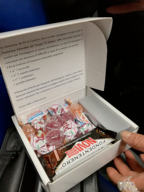 E’ stato distribuito ai pendolari anche un kit di conforto dotato di torcia a led, coperta isotermica, dolcetti e scaldamani.