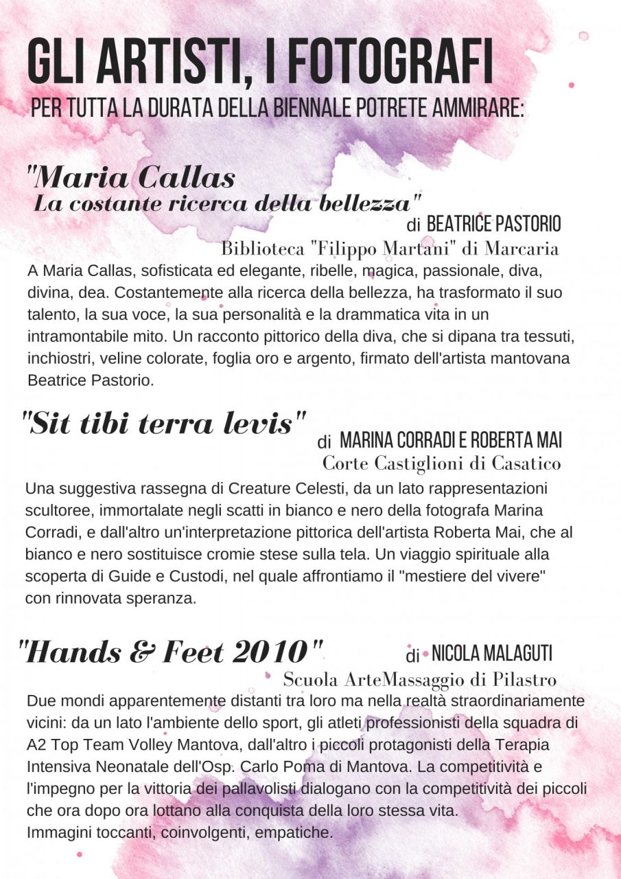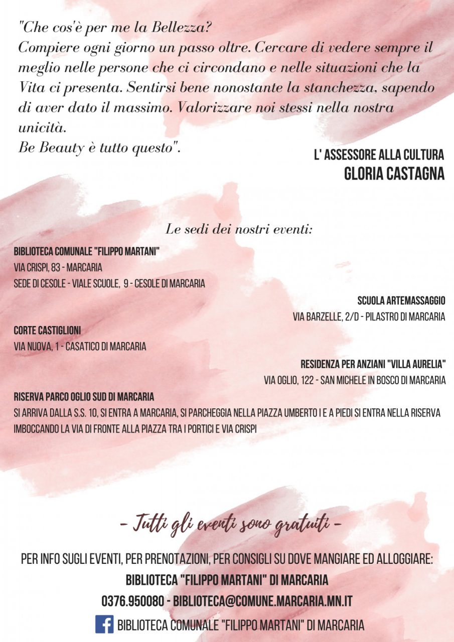 “La Biennale è il risultato di un percorso iniziato ormai diversi anni fa”, come spiegano Raffaella Gazzoni e Daniela Bottoni di Scuola Artemassaggio, “dove la bellezza dell’individuo (in un concetto ampio del suo significato) e la sua valorizzazione, sono state il punto di partenza per attività a sfondo sociale e collaborazioni importanti con IOM di Mantova e le Associazioni di volontariato come La Quercia e l’Agorà. Nei momenti difficili della nostra vita è sempre necessario non lasciarsi andare e sentirsi bene prima con noi stessi e poi con gli altri. In questo Festival, cercheremo di passare alcuni messaggi importanti al pubblico spettatore, ma soprattutto cercheremo di divertire e dare benessere. Il Comune di Marcaria e la Biblioteca comunale hanno sostenuto e promosso questo importante evento, perché con noi condividono questi temi e questo impegno nel sociale. La bellezza è di tutti, quindi Be Beauty!”