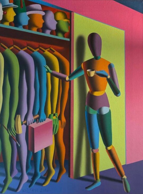Nei dipinti esposti troveremo da un lato i tratti distintivi dell’artista americano, che con il tempo sono diventati delle vere e proprie costanti, come la citazione di altre opere e la raffigurazione di soggetti senza volto che richiamano le figure dei manichini di De Chirico.