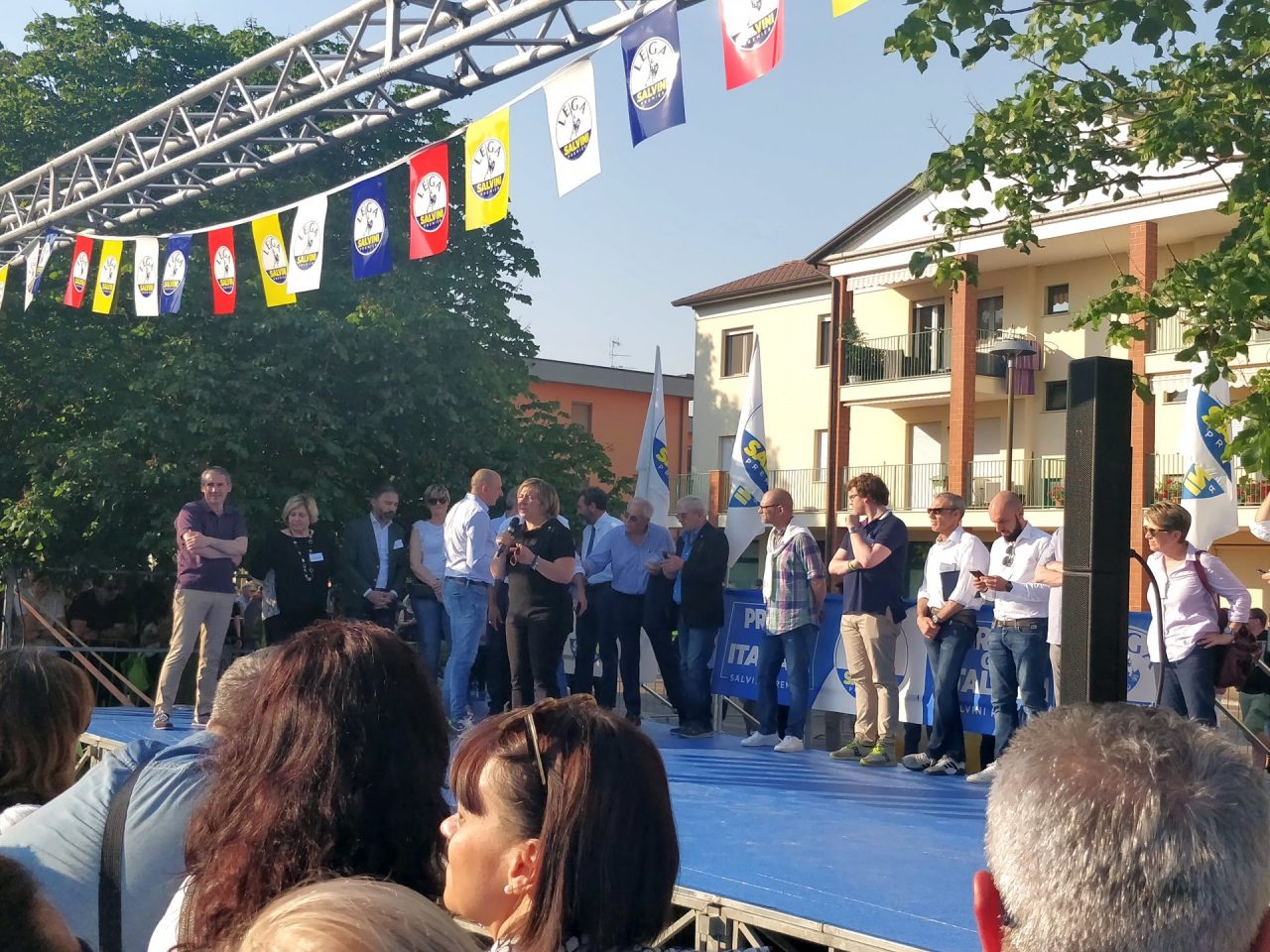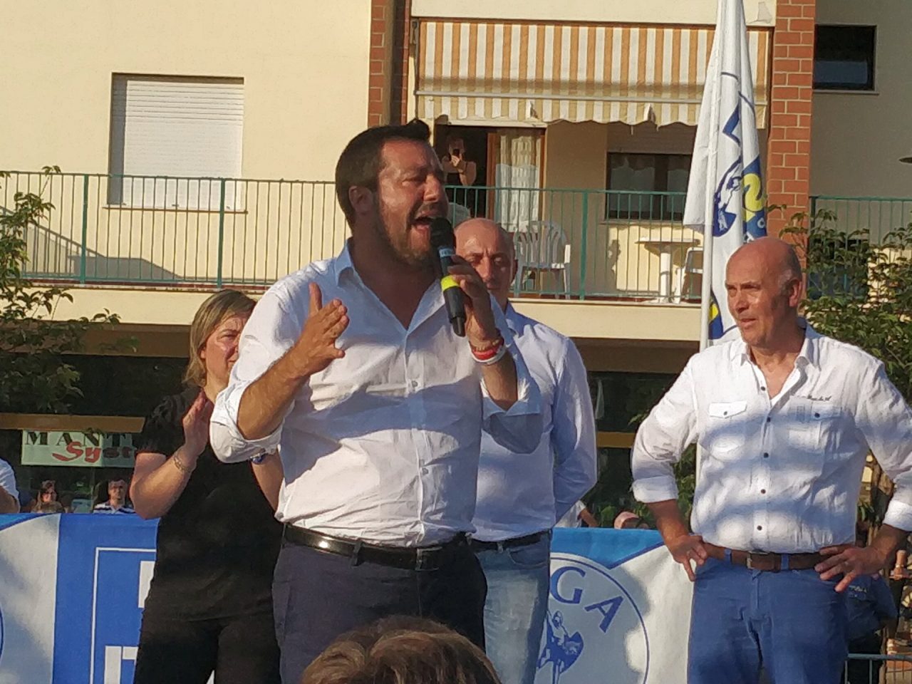 Nell’attesa dell’arrivo di Salvini, sul palco salgono il segretario provinciale della Lega Antonio Carra, il deputato e vicesindaco di Castiglione delle Stiviere Andrea Dara, il deputato Paolo Grimoldi e tutti i sindaci di centrodestra, apertamente sostenuti solo sponsorizzati dalla Lega, che hanno vinto le elezioni di domenica 26 maggio 2019 o che già amministrano Comuni mantovani. Tra questi vi è anche la candidata sindaco di Porto Mantovano Monica Buoli, che si difende dagli attacchi del centrosinistra ai quali – come consigliato anche da Salvini – intende rispondere con il sorriso.