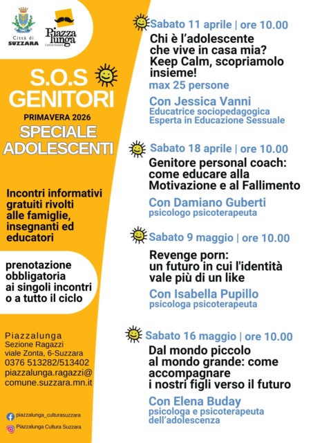 “SOS Genitori” torna in primavera con un nuovo ciclo di incontri gratuiti dedicati a genitori, insegnanti ed educatori, in programma dall’11 aprile al 16 maggio alla Piazzalunga Cultura di Suzzara. Il percorso, attivo da oltre dieci anni, affronta temi legati agli adolescenti, alle loro difficoltà e potenzialità, offrendo strumenti per migliorare il clima familiare e comprendere i fenomeni che li riguardano. Gli incontri sono guidati da psicologi e psicoterapeuti del territorio e dell’Università di Milano. Partecipazione gratuita con prenotazione obbligatoria.