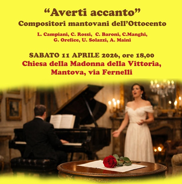 “Averti accanto” è il concerto dedicato ai compositori mantovani dell’Ottocento, in programma l’11 aprile dalle 18 alle 20 presso Madonna della Vittoria. L’iniziativa, curata dall’Associazione Pietro Pomponazzo, valorizza autori locali che tra fine ’800 e inizio ’900 contribuirono alla diffusione della lirica e alla vita musicale dell’epoca. Un’occasione per riscoprire pagine poco note del patrimonio musicale mantovano. L’ingresso è a pagamento.
