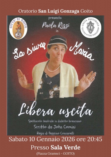 L’Oratorio San Luigi Gonzaga di Goito porta in scena lo spettacolo teatrale in dialetto bresciano “La sciura Maria – Libera Uscita” con Paola Rizzi. L’appuntamento è fissato per sabato 10 gennaio 2026 alle 20.45 nella Sala Verde. Protagonista è l’amatissima Signora Maria con il suo irresistibile sguardo sul mondo di paese.