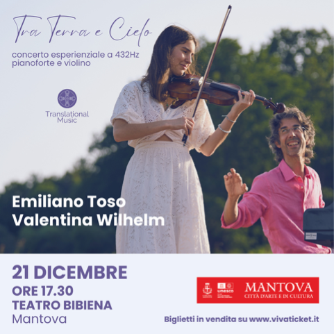Un viaggio nella musica, un concerto esperienziale con pianoforte e violino a 432Hz che si chiama “Tra Terra e Cielo”. L’appuntamento è alle 17.30 di domenica 21 dicembre al Teatro Bibiena di Mantova. Un momento unico, di condivisione e di immersione nelle emozioni, dove la melodia del pianoforte di Emiliano Toso si unisce a quella del violino di Valentina Wilhelm.