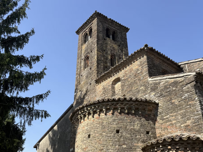 Realizzato interamente in mattoni, presenta una struttura semplice e armoniosa, con un campanile slanciato ornato da monofore e bifore. L’interno, a navata unica, conserva affreschi trecenteschi di grande valore nel presbiterio.